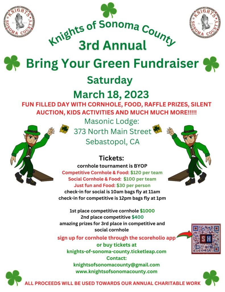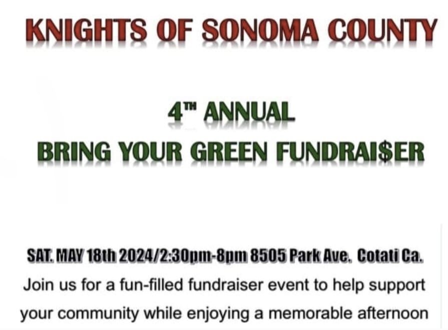 The Knights of Sonoma County stay active all year through hands on outreach, holiday giving, and community events. From Thanksgiving burrito handouts and feeding people at local homeless shelters, to supporting the elderly and hosting fundraisers like our Bring Your Green event with auctions, bingo, and raffle ticket prizes, everything we do is about giving back.